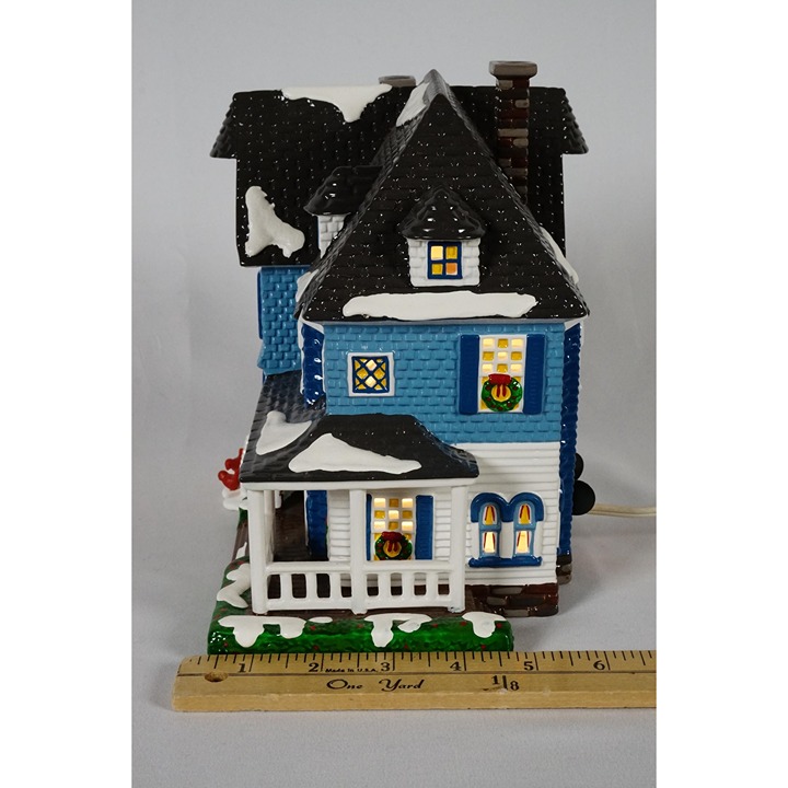 Bring a touch of nostalgic charm to your holiday display with this delightful 1996 Department 56 Shingle Victorian Village House. Part of the beloved Original Snow Village collection, this hand-painted ceramic house features intricate architectural details, including a steeply pitched roof with simulated snow, charming blue and white siding, and inviting window designs adorned with festive wreaths. This piece measures approximately 8 inches tall and 9 inches wide, making it a wonderful focal point or addition to an existing village scene. The house comes complete with its original box and a light cord to illuminate its cozy windows, creating a warm and inviting glow.
